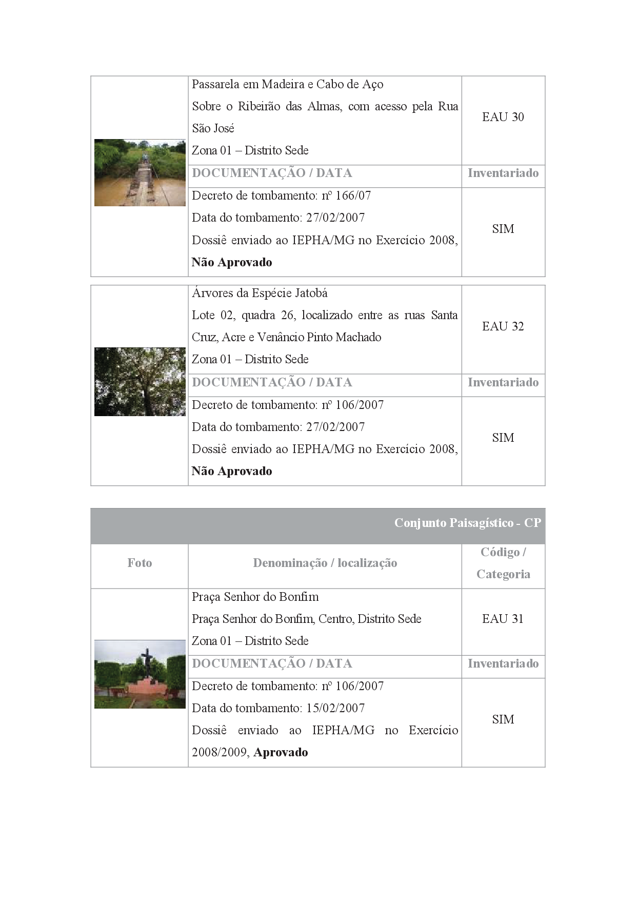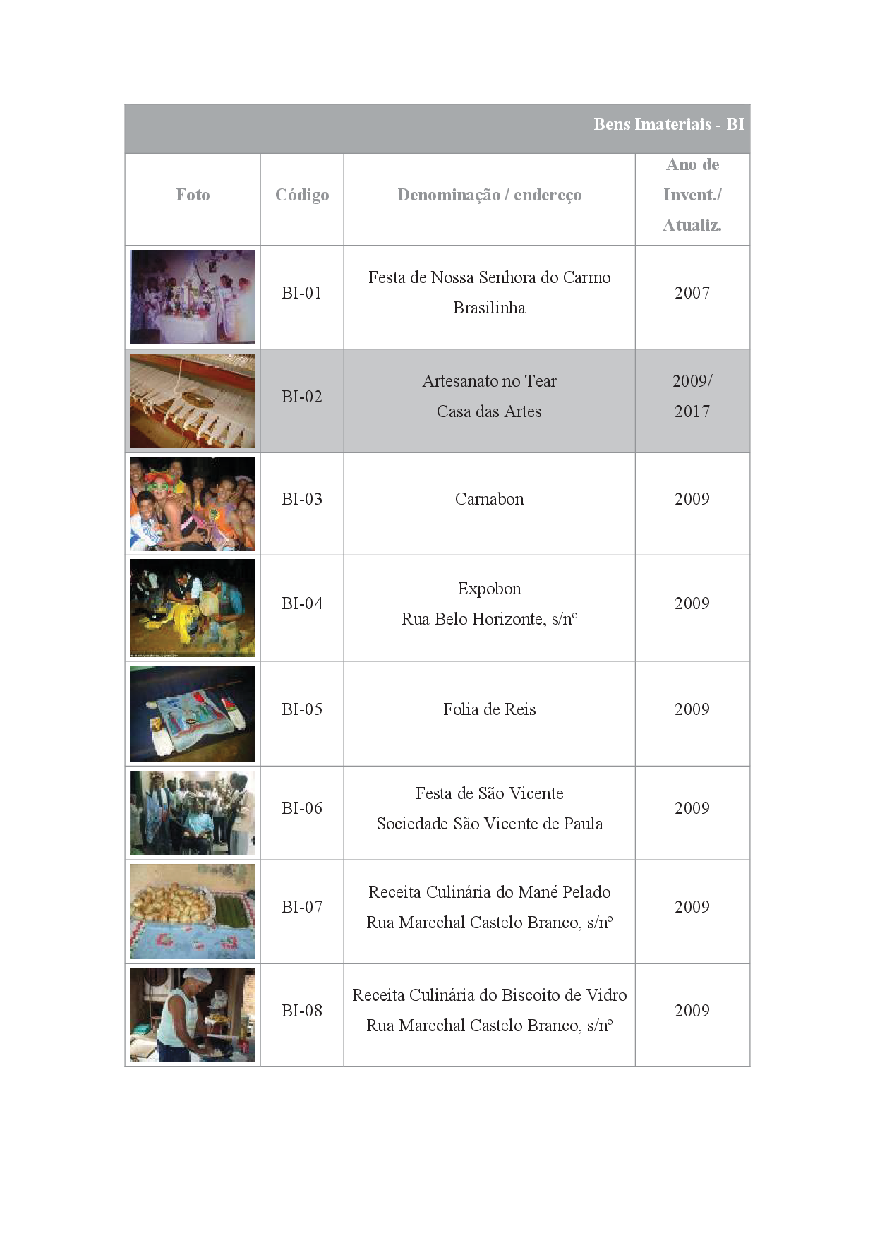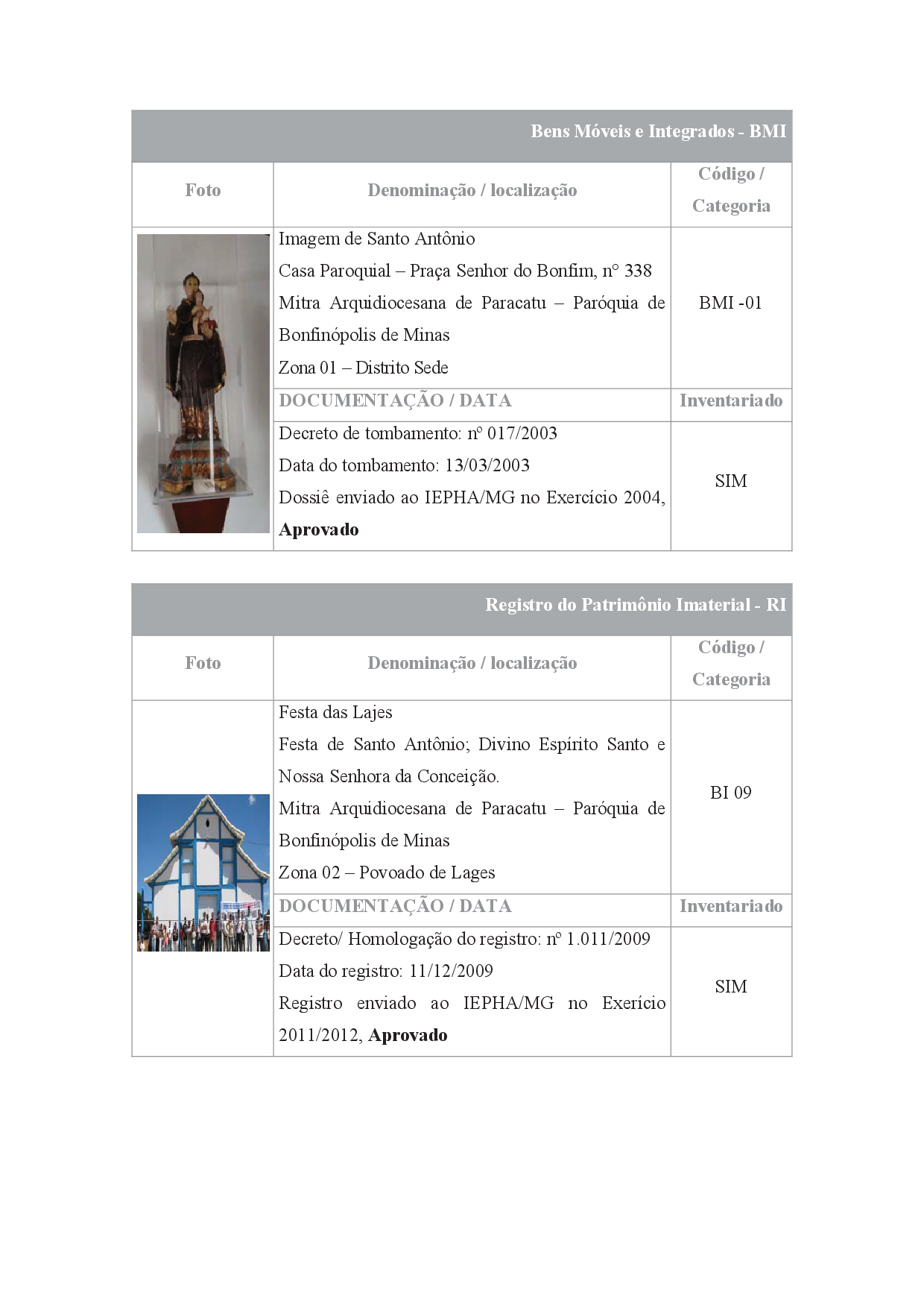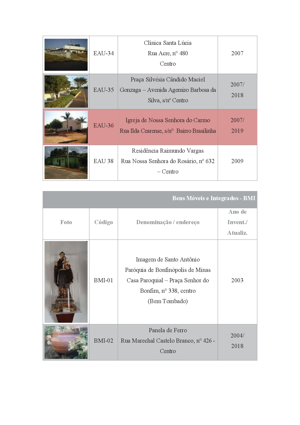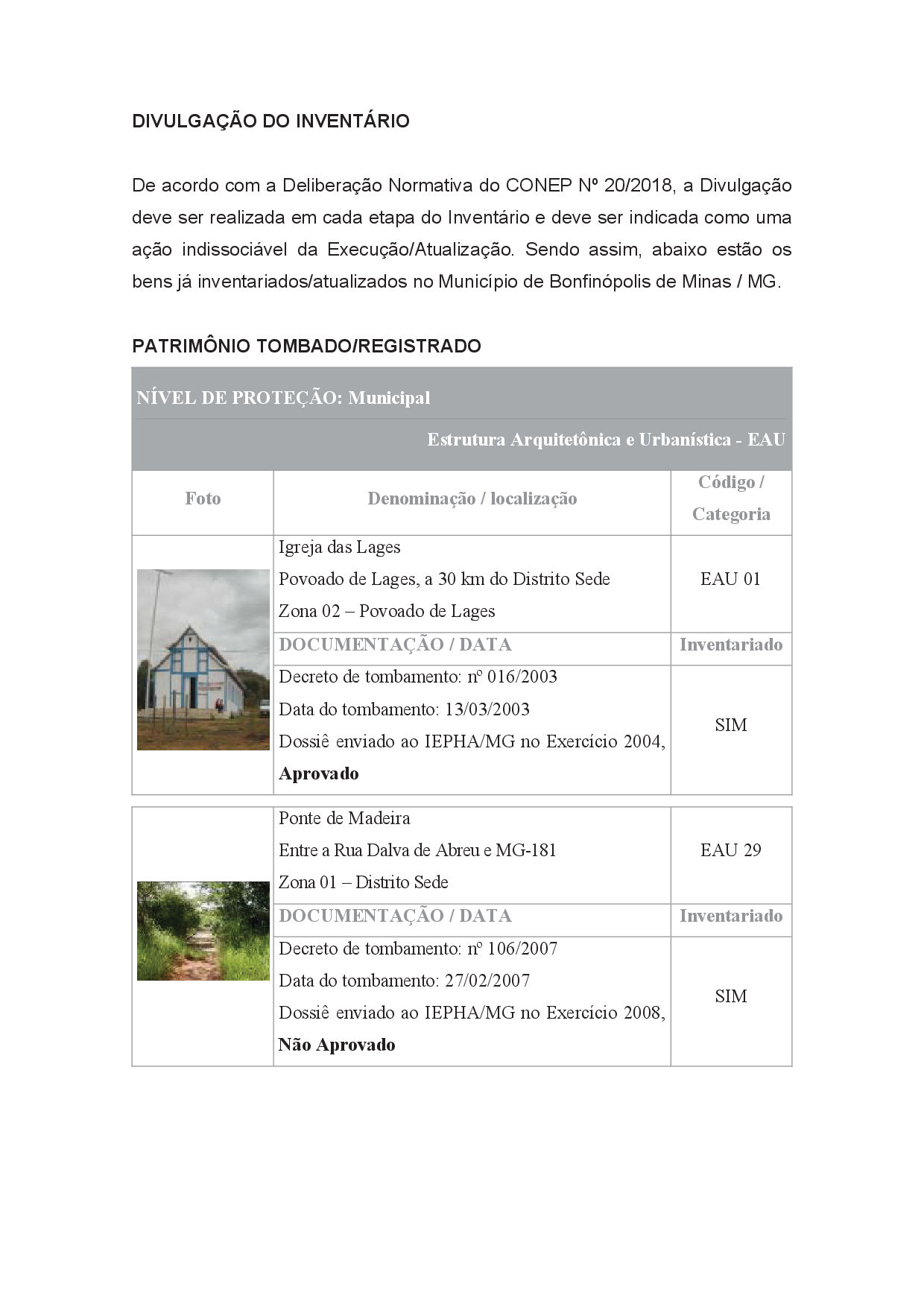 Abaixo temos o Inventário do Patrimônio Cultural de bens inventariados e tombados do Município de Bonfinópolis de Minas.