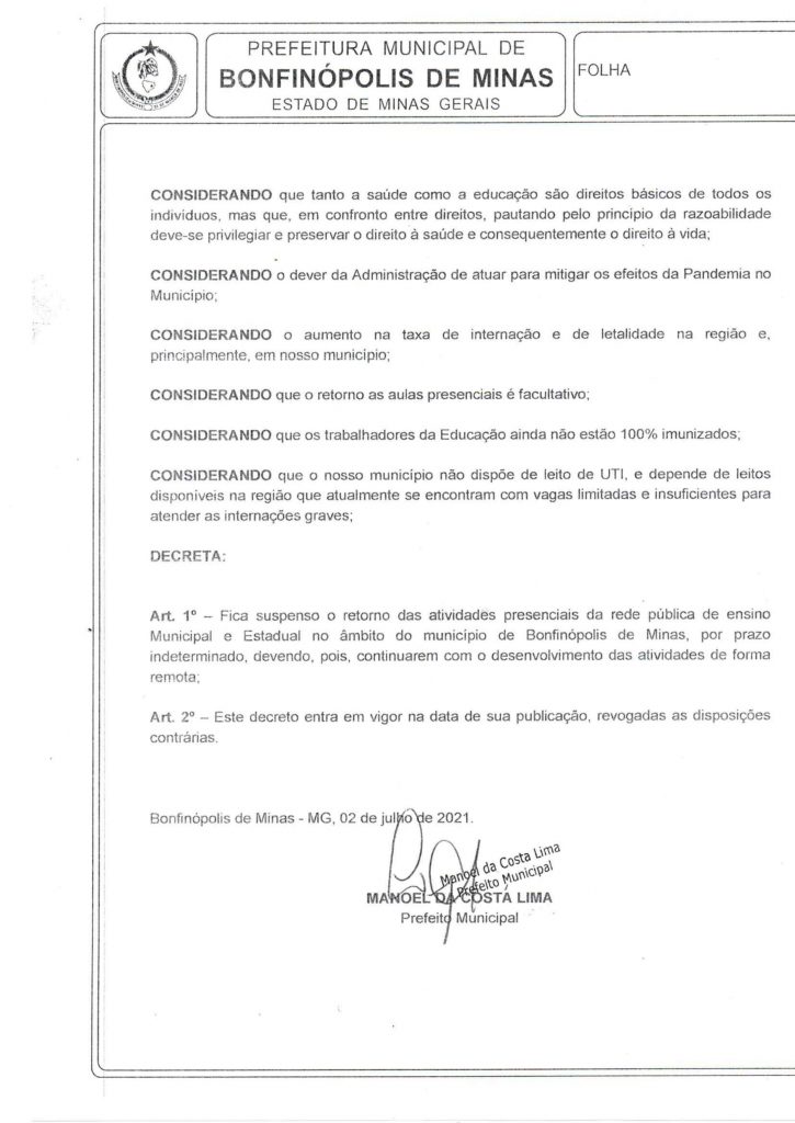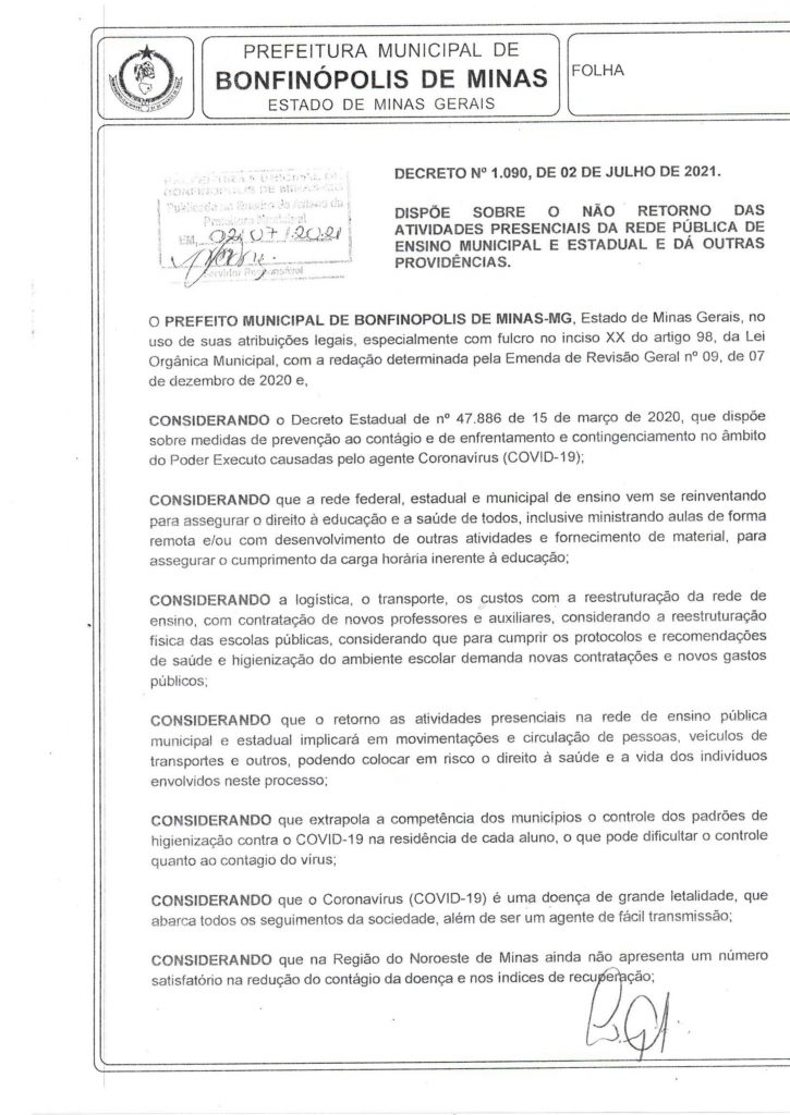 Decreto 1.090, que dispõe sobre o não retorno das atividades presenciais da rede pública de ensino do município de Bonfinópolis de Minas
