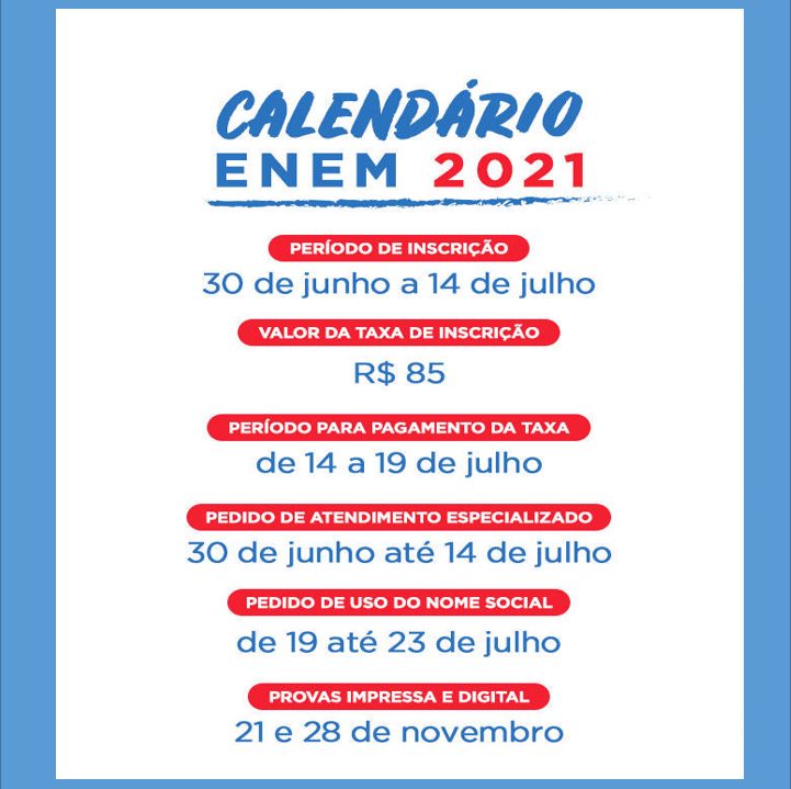A Administração Municipal através da Secretaria Municipal de Educação comunica à todos que estão abertas, no período de 30/06/2021 a 14/07/2021, as inscrições para o Exame Nacional do Ensino Médio (Enem), com previsão de aplicação das provas nos domingos de 21 e 28/11/2021, tanto para a versão impressa quanto digital.