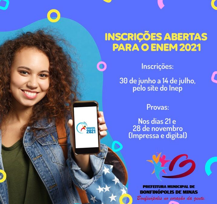A Administração Municipal através da Secretaria Municipal de Educação comunica à todos que estão abertas, no período de 30/06/2021 a 14/07/2021, as inscrições para o Exame Nacional do Ensino Médio (Enem), com previsão de aplicação das provas nos domingos de 21 e 28/11/2021, tanto para a versão impressa quanto digital.