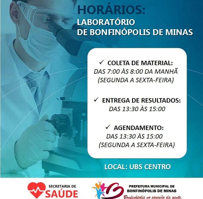 A Secretaria Municipal de Saúde informa a população sobre os horários de atendimento do laboratório municipal de exames