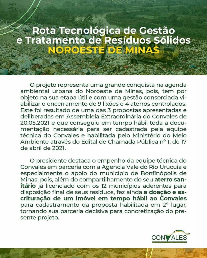 A Covales anunciou que serão 13 municípios da região Noroeste de Minas que serão beneficiados com R$ 8,3 milhões do Programa Nacional Lixão Zero para construção de uma Usina de Triagem Mecanizada de Resíduos Sólidos em Bonfinópolis de Minas.