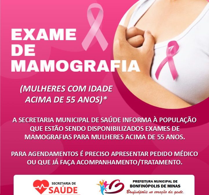 14 setembro, 2021A Secretaria Municipal de Saúde informa a população que estão sendo disponibilizadas Exames de Mamografias para mulheres acima 55 anos