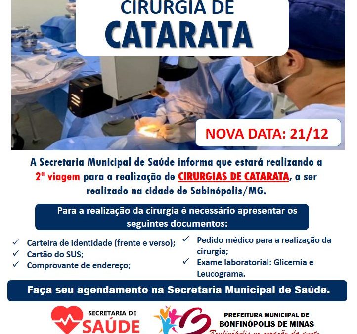A Secretaria Municipal de Saúde informa que estará organizando a 2ª viagem para realização de Cirurgias de Catarata.