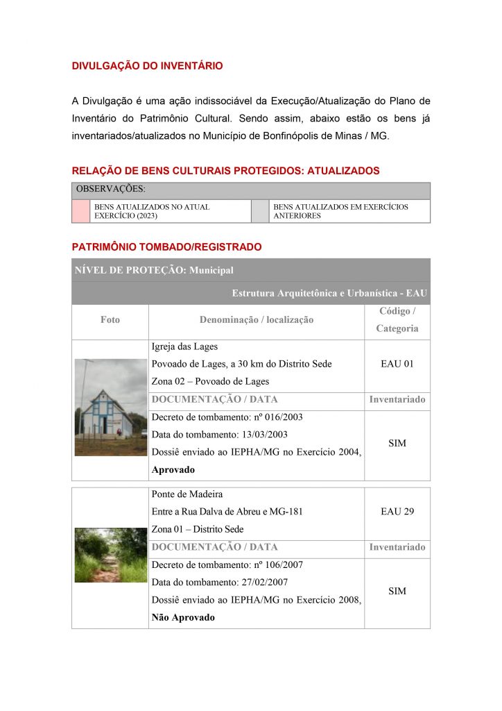 Divulgação do Patrimônio Cultural de Bonfinópolis de Minas: Inventário