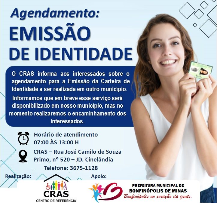 Devido as inúmeras solicitações, o CRAS – Centro de Referência da Assistência Social informa que estará realizando o agendamento para a pessoas que necessitem da emissão da Carteira de Identidade.